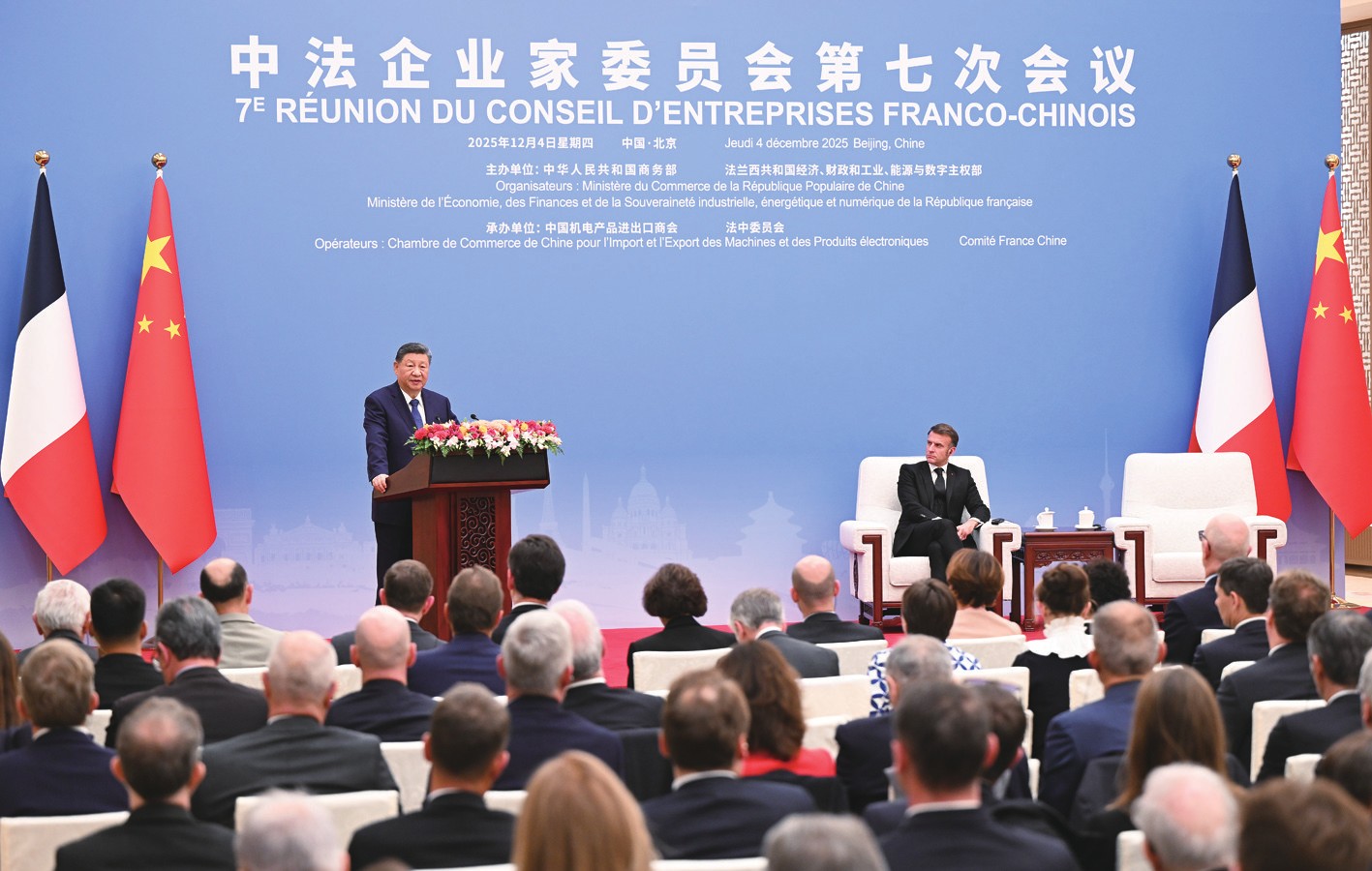 【新华社北京12月4日电】12月4日中午,国家主席习近平在北京同法国总统马克龙共同出席中法企业家委员会第七次会议闭幕式并致辞。 习近平指出,今年是中法关系“新甲子”的开局之年。两国经贸合作领域不断拓展、韧性不断增强。前10个月,双边贸易额达到687.5亿美元,双向投资额累计超过270亿美元。双方要秉持建交初心,抓住机遇、深化合作,推动两国关系行稳致远,共同谱写中法合作更加美好的篇章,以中法关系的稳定性应对当今世界的不确定性。 一是不断拓展双边经贸合作新领域。中方视法方为重要的、不可或缺的经贸合作伙伴,欢迎法方积极参与中国式现代化进程,支持有实力、有意愿的中方企业赴法投资兴业。双方要挖掘人工智能、绿色和数字经济、生物医药、银发经济等新兴领域合作潜力,持续推动产业链供应链开放合作,为两国企业提供公平、透明、非歧视、可预期的营商环境。 二是继续推动中欧互利合作新发展。今年是中欧建交50周年。中欧经贸关系的本质是优势互补、互利共赢,完全能够在发展中实现动态平衡。相互依赖不是风险,利益交融不是威胁。中法双方要推动中欧坚持全面战略伙伴关系定位,共创中欧关系更加光明的下一个50年。 三是共同为改革完善全球治理作出新贡献。今年是世界反法西斯战争胜利和联合国成立80周年。为了推动构建更加公正合理的全球治理体系,继全球发展倡议、全球安全倡议、全球文明倡议后,今年9月我提出全球治理倡议。中法两国要践行真正的多边主义,共同维护联合国地位和权威,维护以世界贸易组织为核心、以规则为基础的多边贸易体制,为改革完善全球治理贡献正能量。 习近平强调,中共二十届四中全会审议通过了“十五五”规划建议。中国将全面推进中国式现代化,扩大高水平对外开放。欢迎法国企业家继续共享中国发展红利。 中法两国政府、企业等各界代表约150人参加闭幕式。 王毅参加上述活动。 (董雪 冯歆然) (图)十二月四日中午,国家主席习近平在北京同法国总统马克龙共同出席中法企业家委员会第七次会议闭幕式并致辞。新华社记者谢环驰/摄