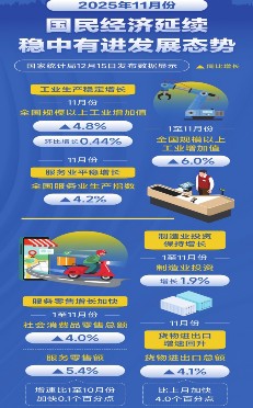 ■新华社记者王雨萧黄垚 15日,我国11月份主要经济指标出炉。各项指标运行情况如何?国民经济呈现哪些趋势特点?在国新办当天举行的新闻发布会上,国家统计局新闻发言人付凌晖介绍了相关情况。 国民经济延续稳中有进发展态势 付凌晖介绍,11月份我国生产供给基本平稳,就业形势总体稳定,市场价格继续改善,新质生产力稳步发展。 生产增势平稳。11月份,全国规模以上工业增加值同比增长4.8%。产业升级发展带动下,装备制造业增加值同比增长7.7%,对规模以上工业增加值增长的贡献率达到59.4%。当月全国服务业生产指数同比增长4.2%。 市场销售扩大。11月份,社会消费品零售总额同比增长1.3%,部分升级类商品销售较快增长。 “前11个月,社会消费品零售总额同比增长4%,增速不仅快于上年同期,也快于上年全年。近期社零总额增速有所回落,主要是因为去年同期基数较高。从累计增速来看,今年社零总额增长好于去年。”付凌晖说。 付凌晖介绍,前11个月,固定资产投资(不含农户)同比下降2.6%,扣除房地产开发投资后的项目投资增长0.8%。尽管投资增速下降,但在扩大内需政策和产业升级发展等带动下,重点领域投资保持增长,继续为经济中长期发展打下基础。 在外部环境复杂严峻、上年同期基数较高背景下,我国外贸保持稳定增长。11月份,我国货物进出口总额同比增长4.1%,增速比上月加快4个百分点,其中出口增长5.7%,增速由上月下降转为增长。 从就业和物价看,11月份,全国城镇调查失业率为5.1%,与上月持平;全国居民消费价格指数(CPI)同比上涨0.7%,涨幅比上月扩大0.5个百分点,连续3个月回升。 今年,我国粮食产量14297.5亿斤,比上年增长1.2%,稳定在1.4万亿斤以上。 付凌晖表示,总的来看,11月份国民经济运行总体平稳,延续稳中有进发展态势。但外部不稳定不确定因素较多,国内有效需求不足,经济运行仍面临不少挑战。 新质生产力培育取得积极成效 付凌晖表示,今年以来,各地区各部门加强科技创新力度,培育和发展新质生产力,取得了积极成效。 数据显示,1至11月份,规模以上高技术制造业增加值同比增长9.2%,智能消费设备制造业增加值增长7.6%。人工智能、具身智能等科技前沿领域加快突破,对产业升级引领作用增强。 “各方面积极加大创新投入,推进科技创新和产业创新深度融合,产业高端化智能化势头向好。”付凌晖说。 新原料、新材料加工制造快速增长,有力支撑相关传统行业增长。1至11月份,生物质燃料加工行业增加值同比增长15.6%,对石油加工行业增长贡献率同比提高1.6个百分点;生物基材料制造行业增加值增长29%,对化纤行业增长贡献率同比提高18.4个百分点。 “数字技术广泛渗透、数字经济不断拓展,1至11月份,规模以上数字产品制造业增加值同比增长9.3%,信息传输、软件和信息技术服务业生产指数增长11.3%。”付凌晖说。 此外,绿色低碳发展深入推进。1至11月份,规模以上工业水电、核电、风电和太阳能发电量同比增长8.8%;新能源汽车、汽车用锂离子动力电池产量分别增长26.5%、42.2%。 “数字化、绿色化转型深入推进,新能源产业、数字产品制造快速发展,带动相关产品价格上涨。11月份,有色金属冶炼和压延加工业价格同比上涨7.8%,集成电路制造价格上涨1.7%。”付凌晖说。 实现全年预期目标有较好条件 付凌晖表示,从全年情况看,尽管有困难有压力,但我国经济韧性强,宏观政策支持有力,新动能稳步成长,实现全年预期目标有较好条件。 “今年以来,各地区各部门加紧实施更加积极有为的宏观政策,对于支持经济平稳运行发挥了重要作用。”付凌晖说。 数据显示,消费品以旧换新政策发力显效,1至11月份,限额以上单位家用电器和音像器材类、文化办公用品类、通讯器材类商品零售额同比分别增长14.8%、18.2%和20.9%。大规模设备更新政策带动下,前11个月设备工器具购置投资同比增长12.2%,拉动全部投资增长1.8个百分点。“两重”建设持续推进,重点领域相关投资继续扩大。 付凌晖表示,“两重”建设和“两新”政策实施,全国统一大市场建设纵深推进,扩大了需求、促进了生产、推动了经济。近期,有关部门积极推动落实进一步促进消费、扩大有效投资、推动新场景大规模应用的政策措施,将有利于增强经济增长动能,助力实体经济发展。 近日多家国际机构密集上调2025年中国经济增速预期。其中,世界银行、国际货币基金组织、亚洲开发银行分别上调0.4、0.2、0.1个百分点。 “在看到风险挑战的同时,也要看到,我国经济基础稳、优势多、韧性强、潜能大,长期向好的支撑条件和基本趋势没有变,创新驱动作用增强,改革开放不断深化,现代化产业体系加快建设,将有力支撑经济向好发展。”付凌晖说。