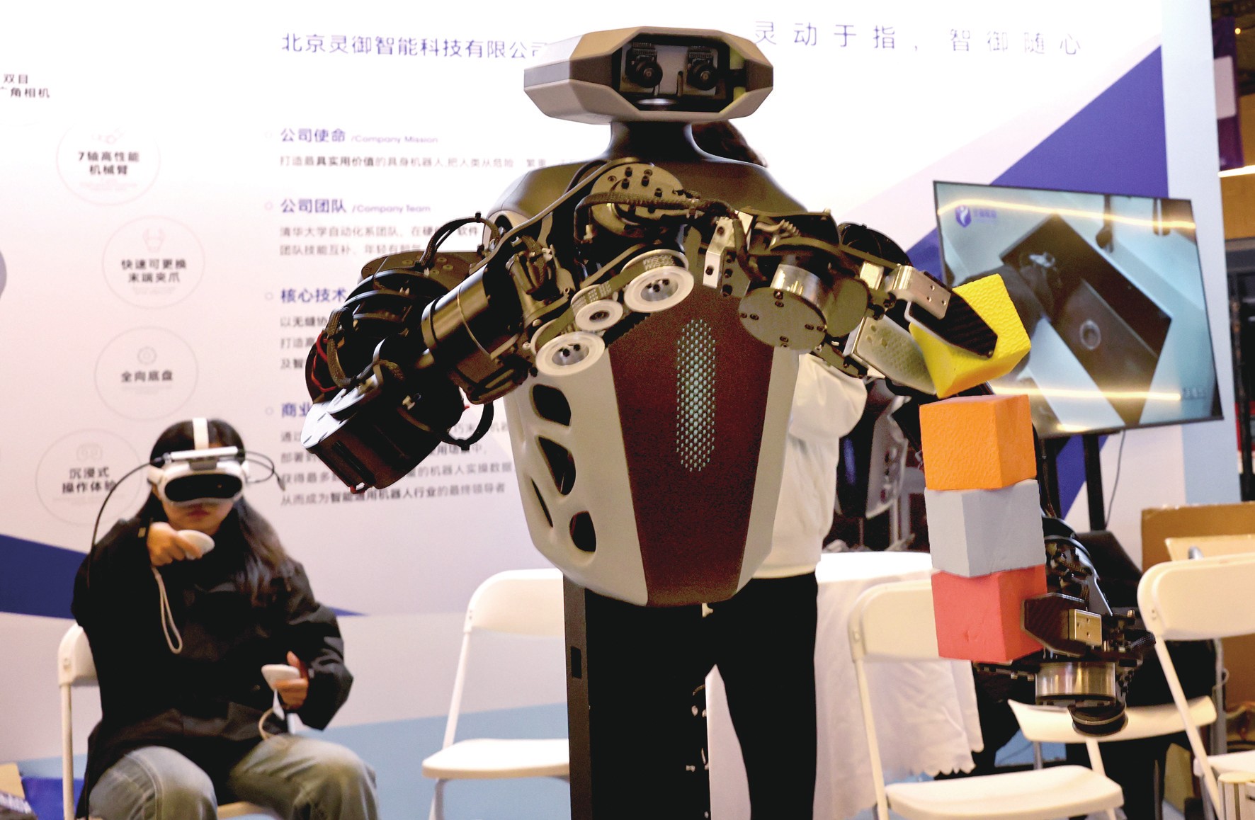 近日,2025全球开发者先锋大会暨国际具身智能技能大赛在上海张江科学会堂举行。大会设置“竞技场”“实验工坊”“思辨广场”“节日”等多元板块,打造技术比拼、思想交锋、产业展示与科普体验全面融合的平台。图为工作人员(后)与机器人配合进行悬空搭积木演示。