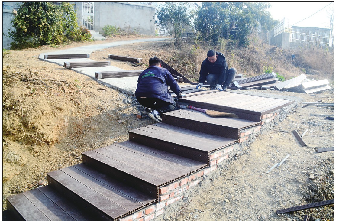 安徽美森鑫源新材料科技有限公司近年来积极投身公益事业与和美乡村建设,为巢湖市苏湾镇半份村免费修建东坡亭,登山旅游步道等,推进乡村振兴,受到广大村民称赞。图为安徽美森鑫源新材料科技有限公司工人正在巢湖市苏湾镇半份村免费安装环保新材料步道。