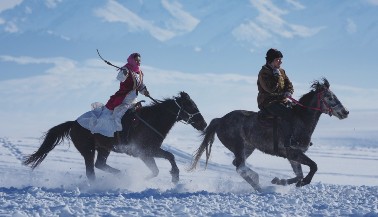 1月3日,牧民在新疆昭苏湿地公园为游客表演。寒冬时节,新疆昭苏县一片银装素裹。当地借助独特冰雪资源,开发冰雪乐园、“天马踏雪”等冰雪旅游产品,吸引各地游客前来游玩。新华社记者胡虎虎/摄