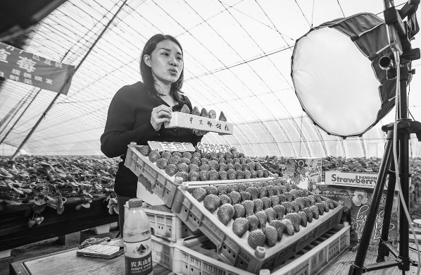 一月十二日,在辽宁东港一个草莓大棚内,种植户在直播销售草莓。辽宁省东港市是我国最大的草莓生产和出口基地,全市草莓种植面积稳定在二十万亩左右,鲜果年产值超六十亿元,十万多农户从事草莓生产。近年来当地多措并举,通过人才支撑、品牌培育、资金扶持等方式全力推动草莓产业迈向高质量发展。新华社记者潘昱龙/摄