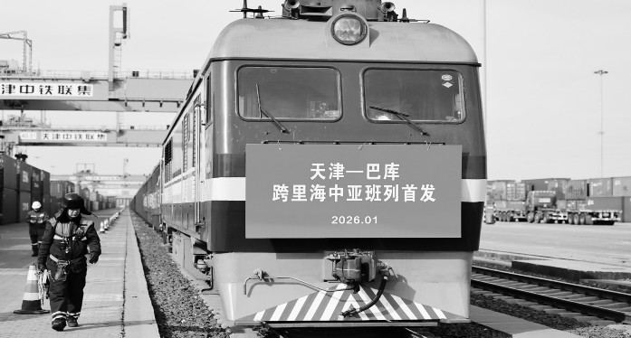 1月19日拍摄的天津—巴库跨里海中亚班列首发现场。1月19日,一列满载不锈钢管材、家电等货物的中亚班列从中国铁路北京局集团有限公司所属的天津集装箱中心站驶出,将经由霍尔果斯口岸出境至哈萨克斯坦阿克套港,最终经里海海运至阿塞拜疆巴库。据了解,巴库作为阿塞拜疆首都,与哈萨克斯坦港口城市阿克套隔“海”相望,是跨里海国际多式联运运输通道的重要节点。该趟列车是天津开行的首趟至巴库跨里海中亚班列,为天津与阿塞拜疆、哈萨克斯坦等国家互联互通增添了稳定快捷的货运新通道。新华社记者李然/摄