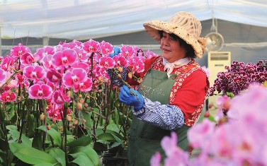 春节临近,山东省青岛市即墨区灵山花卉文化产业园的年宵花迎来生产和销售旺季,花农们按照订单外运各类花卉,供应节日市场。图为花农在青岛市即墨区灵山花卉文化产业园管护花卉。新华社发张光明/摄
