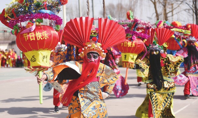 春节将至,各地年味渐浓。人们购年货、逛集市、参加喜庆活动,欢喜迎新春。图为在甘肃省临夏回族自治州永靖县西河镇白川村,村民表演社火节目。
