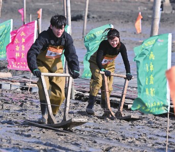 近日,一场滩涂“木泥马”挑战赛在福建省霞浦县冬瓜山赶海基地举行,选手们用传统赶海工具“木泥马”(又称“泥橇”)在滩涂上接力滑行、奋勇争先,以别样方式迎接马年春节。“木泥马”这一传统渔具如今变身地方特色文旅项目,成为游客赶海新玩法。同时,霞浦县宏昌工业文创基地内的跑马场和马文化美术展也随春节临近热度攀升,吸引游客参观、体验。图为2月8日,在霞浦县滩涂“木泥马”挑战赛上,选手们奋力向前滑行。新华社记者姜克红/摄
