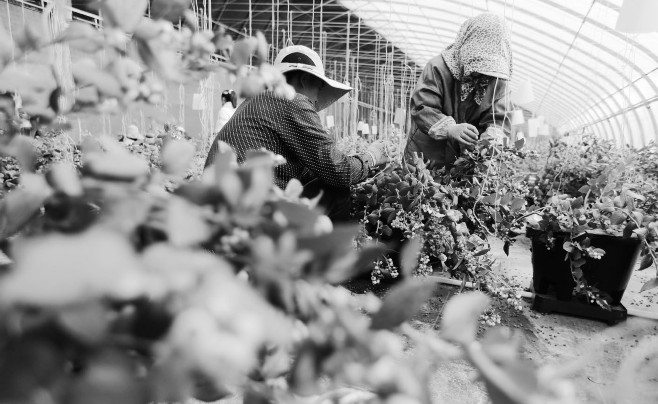 2月12日,两名工人在定西市安定区鲁家沟镇蓝莓种植产业园的温室大棚劳作。春节临近,甘肃省定西市安定区鲁家沟镇蓝莓种植产业园的3万株蓝莓即将进入采摘期,成为深受消费者青睐的“新春佳果”。2024年以来,当地因地制宜发展智慧农业,通过“企业+合作社+农户”的模式,引入耐寒抗旱的蓝莓品种,在标准化温室大棚中采用无土栽培技术并配套物联网设备,成功发展了规模化种植的高原蓝莓产业,盛果期年产量可达8万斤,帮助农民拓宽增收渠道,为乡村振兴注入“甜蜜动能”。新华社发王克贤/摄