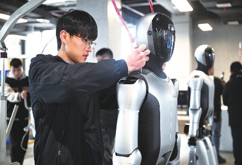 日前,在广西柳州机器人产业园里,吴东波摘取工业人形机器人挂钩进行作业动作练习。在广西柳州机器人产业园,“00后”机器人训练师坚守岗位,专注教工业人形机器人掌握基础动作,他们被称为机器人“奶爸”。2001年出生的吴东波就是其中一员。据了解,春节过后,该中心将同步训练120台机器人,日均产出1万条数据。