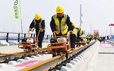 3月10日,济(南)滨(州)高铁正式进入全线铺轨作业阶段。济滨高铁是津潍高铁和山东省快速铁路网鲁北通道的重要组成部分,也是国家铁路网“八纵八横”高速铁路网主骨架京沪、青太通道的重要联络线,设计时速350公里。图为3月10日,在济(南)滨(州)高铁山东滨州站,中铁四局的工作人员在进行铺轨作业。新华社记者郭绪雷/摄