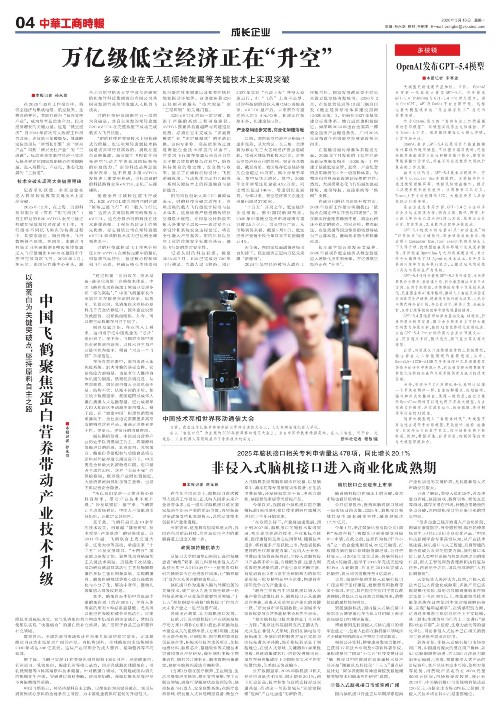 在2026年政府工作报告中,将低空经济与集成电路、航空航天、生物医药并列,共同打造为“新兴支柱产业”,成为培育新质生产力、拉动经济增长的关键力量。这是“低空经济”自2024年首次写入政府工作报告以来,连续第三年被提及,其战略定位实现从“新增长引擎”到“新兴产业”再到“新兴支柱产业”的“三级跳”,标志着我国低空经济已实现从概念界定到国家战略核心的关键跨越,进入规模化、产业化、生态化发展的“主航道”。 技术突破实现两大关键里程碑 记者采访获悉,多家企业在无人机倾转旋翼等关键技术上实现突破。 2025年12月,在上海,时的科技有限公司(简称“时的科技”)自主研发的E20eVTOL全尺寸验证机成功完成倾转过渡试飞工作,飞行器在不同试飞架次的转换过程中,均姿态稳定、响应精准,飞行数据符合预期。在四川,由联合飞机集团自主研制的6吨级倾转旋翼无人飞行器镧影R6000在德阳市什邡市完成首次飞行。2026年2月,在天津,由国际竹藤中心牵头,联合北京航空航天大学宁波创新研究院和龙竹科技集团股份有限公司共同研发的竹基倾转旋翼无人机首飞成功。 时的科技研发取得的另一项重大突破是,其自主研发的倾转旋翼E20eVTOL在完整构型下成功完成载多人飞行试验。 “时的科技在关键技术上里程碑式的跨越,也证明倾转旋翼技术路线是切实可行且高效的,展现在复杂系统集成、高可靠性飞控软件和先进空气动力学等领域国际领先的研发能力。”时的科技品牌总监徐安表示,这不仅是中国eVTOL发展史上重要里程碑,也标志着时的科技跻身全球eVTOL主机厂头部梯队。 随着全尺寸倾转过渡飞行成功,E20eVTOL成为国内同时完成“倾转过渡飞行”和“载人飞行试验”这两大关键里程碑的吨级载人eVTOL。这充分展示时的科技在技术路线选择、工程体系建设上的领先优势,标志着该公司在倾转旋翼eVTOL领域的技术实力已达到全球领先水平。 时的科技此轮试飞工作充分验证E20eVTOL在倾转走廊中的整机构型和气动特性,验证核心控制律和飞行品质,并确认核心传感器和执行器的性能需求以及相关的热环境和振动环境等。这也意味着E20已经顺利跨越从“技术验证”到“工程研制”的关键门槛。 E20eVTOL的每一次突破,都源于严谨的系统工程研发路径。eVTOL要兼具垂直起降与高速巡航优势,必须在空中完成从“多旋翼模式”到“固定翼模式”的平滑切换。业内专家称,高品质倾转过渡是衡量企业技术深度的试金石。它要求飞行器在旋翼从垂直升力向水平推力转换的复杂过程中,始终保持极高的稳定性、安全性与效率。验证了在倾转机构设计、飞控逻辑算法、气动优化与动力匹配等一系列关键技术上的深度融合与创新能力。 时的科技创始人兼CEO黄雍威表示,时的科技突破之道在于,沿用成熟的载人飞行器设计标准与技术体系。这意味着严格遵循传统航空器设计规范,在构型设计阶段即植入多重安全层级——通过安全冗余设计和系统安全达标验证,将安全性融入产品基因。时的科技以航空工业的传统安全标准为基石,确保飞行器的绝对安全性。 记者从时的科技获悉,截至2025年7月,E20已完成近700架飞行测试,为载人试飞铺路。预计2027年实现“合法上天”并投入商业运行,打“飞的”上班不是梦。时的科技创始合伙人兼CMO蒋俊表示,eVTOL量产后,未来票价有望达到人均3-4元/公里,和地面打车差不多,但速度快5倍。 产业格局逐步完善,商业化加速落地 目前,国内低空经济产业格局已逐步完善,以大湾区、长三角、京津冀为核心的三大区域经济圈加速崛起,凭借区域优势和技术沉淀,走在低空经济商业化的前列。据企查查数据,截至当前,我国现存低空经济相关企业超过16万家,集中分布于华南、华中及华北地区。其中,2025年全年新增注册企业4.92万家,同比增长超过140%,增速创历史新高。今年以来,低空经济相关企业注册量已超过3700家。 “十五五”开局之年,低空经济加速落地。据中国民航局预测,2035年中国低空经济市场规模有望突破3.5万亿元,增长空间广阔。从市场表现来看,截至3月5日,低空经济产业链个股今年以来平均涨幅接近4%。 近年来,在国家层面政策密集出台加持下,低空经济正迈向万亿元规模“新蓝海”。 2024年低空经济被写入政府工作报告后,国家发展改革委于同年末设立低空经济发展司;2026年2月,市场监管总局等10部门联合印发《低空经济标准体系建设指南(2025年版)》,明确到2027年基本建立标准体系。地方层面也积极跟进,如深圳2024年出台全国第一部低空经济产业促进条例,广州2025年发布首个市级低空经济建设技术指引。 在基础设施与标准体系建设方面,2025年7月发布的《低空经济基础设施框架指引(2025版)》构建了涵盖低空空管、起降、产业配套和应用场景的4个一级指标体系,为物理和信息基础设施建设提供方向。然而,大规模常态化飞行仍需加强起降场、通信导航、监控系统等“路网”支撑。 在商业化路径与场景开放方面,2026年政府工作报告明确提出“鼓励央企国企带头开放应用场景”,旨在解决行业刚需场景不足、商业化闭环不稳定的痛点。电网巡检、物流配送、应急救援等国企掌控的场景将成为产业基本盘,推动技术迭代和标准形成。 长江商学院近期发表文章称,2026年被视作低空经济从概念验证迈入场景化应用的元年,万亿级低空经济