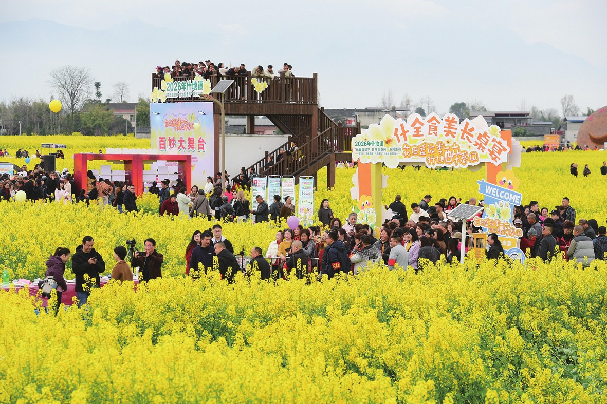 春回大地,四川各地的油菜花次第盛开,人们纷纷走进田野,徜徉在金色花海中,亲近自然,感受春的气息。近年来,四川各地紧扣“花经济”,不断完善生态旅游休闲目的地的服务设施,围绕赏花主题推动农业与旅游深度融合,丰富了春日文旅供给,也激发了乡村消费新活力。图为游客在四川省绵竹市什地镇五方村油菜花田赏花拍照。新华社发王平/摄