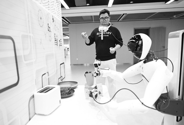 3月17日,在中国雄安集团数字城市科技有限公司具身智能训练场,工作人员对机器人进行具身智能训练。日前,中国雄安集团数字城市科技有限公司具身智能训练场正式投入使用,该训练场采用1∶1实景还原,打造了机器人迎宾导览、工业搬运、家居生活、商业零售、物流装配五大真实场景,开展常态化真机数据采集与标注,收集到的数据向社会开放,助推具身智能技术在城市复杂场景中的规模化应用与商业化落地。新华社记者朱旭东/摄