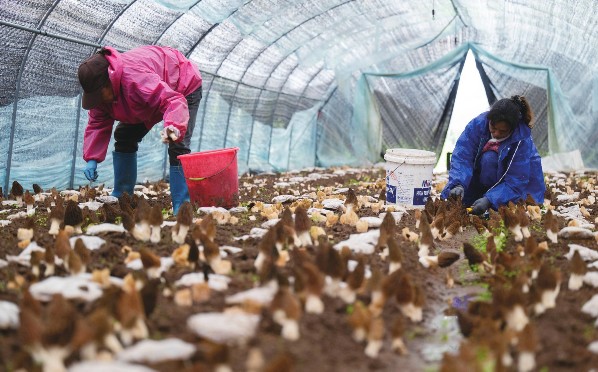 3月15日,在远安县恒昌食用菌专业合作社,工作人员在采摘新鲜羊肚菌。
