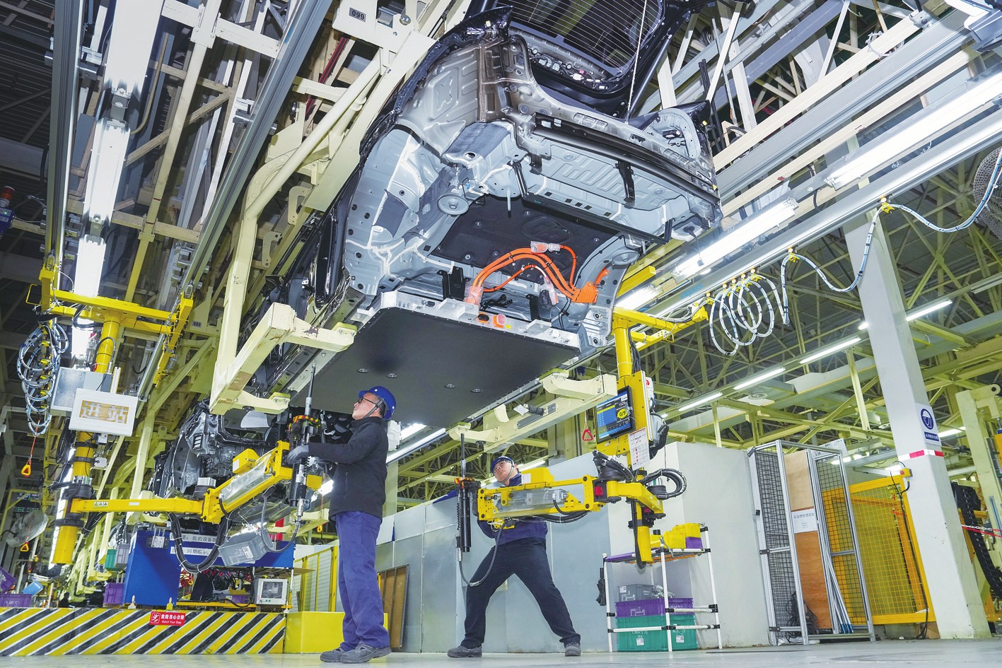 三月十作日,在位于南京市江宁开发区的长安马自达汽车有限公司总装车间内,工人在生产线上进行生产作业。作为全国重要汽车产业基地,江苏构建﹃链主引领、集群支撑、全域协同﹄格局,集聚长安马自达、理想、上汽大通等三十余家整车企业,及三千余家规上零部件企业,形成从研发、制造到配套、服务的完整生态。全省汽车制造业营收、新能源汽车产量、动力电池与零部件产业规模均位居全国前列,产业链完整度与配套能力领先。新华社记者李博/摄