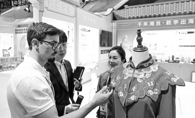 三月十八日,巴西客人(左一)在妈祖文化主题专区了解特色服饰。三月十八日,第六届中国跨境电商交易会暨外贸优品中华行(福建站)在福州开幕。本届跨交会展览面积突破十万平方米,汇聚来自全国八十多个跨境电商产业带的三千三百多家供应链和服务企业,以及来自印尼、越南、新加坡、韩国、日本等国家和地区的参展商参展。新华社记者林善传/摄