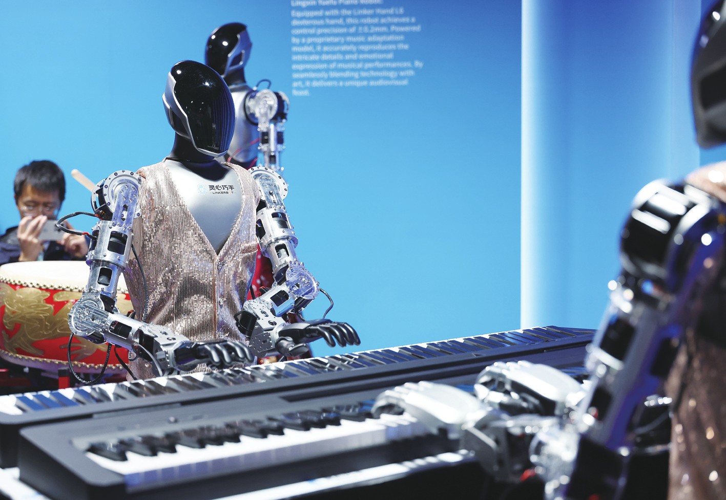 3月24日,在中关村论坛年会新闻中心内,人形机器人在演奏音乐。3月25日至29日,以“科技创新与产业创新深度融合”为年度主题的2026中关村论坛年会将在北京举行。论坛年会设置论坛会议、成果发布、技术交易、前沿大赛、配套活动等五大板块、百余场活动,将有来自100多个国家和地区的上千名嘉宾参与。新华社记者张晨霖/摄
