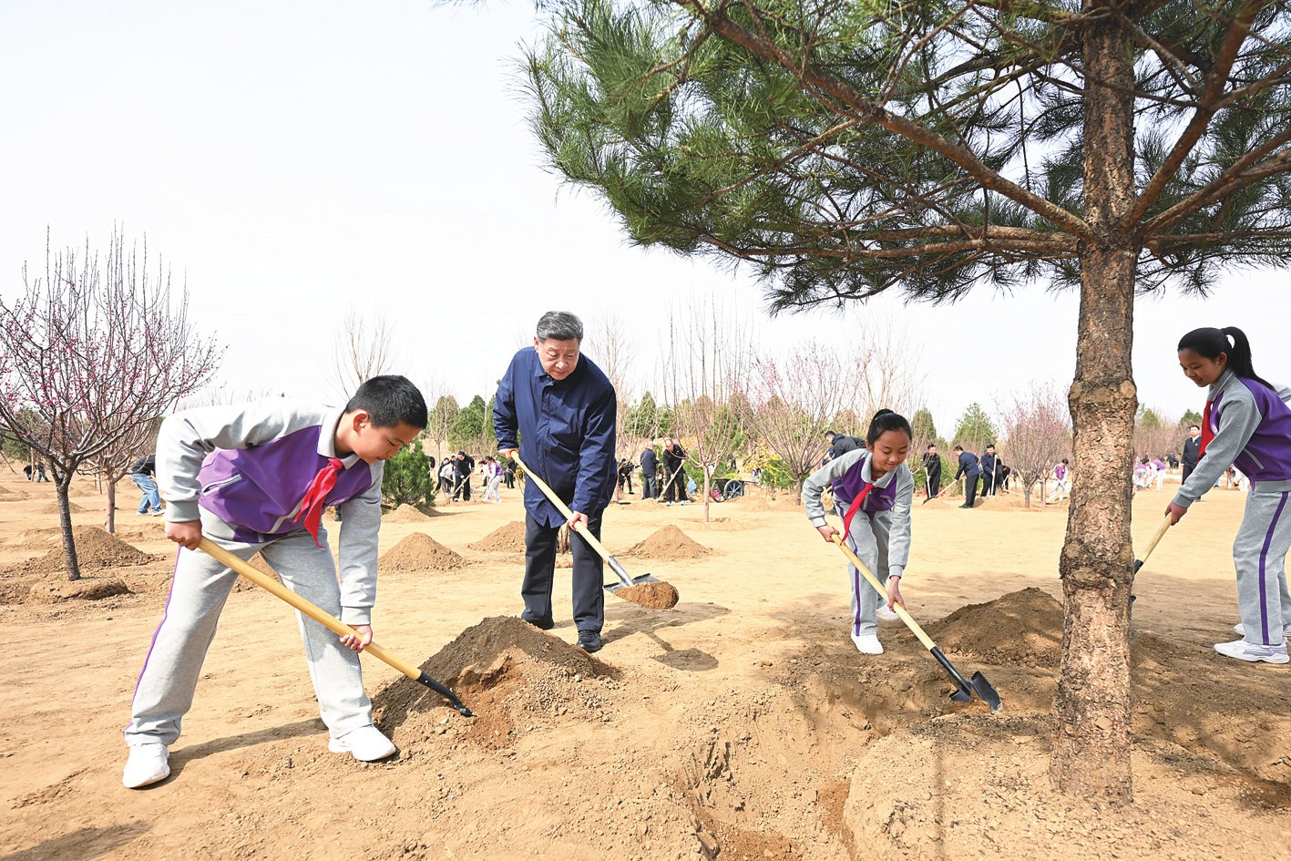 【新华社北京3月30日电】中共中央总书记、国家主席、中央军委主席习近平30日上午在参加首都义务植树活动时强调,良好生态人人共享,也需要合力共建。要组织动员全社会广泛参与植树造林,为山川大地增添锦绣,让中国式现代化的底色更加亮丽。 首都北京春风和煦、万物生发。上午10时40分许,党和国家领导人习近平、李强、赵乐际、王沪宁、蔡奇、丁薛祥、李希等集体乘车,来到昌平区百善镇,同干部群众一起参加义务植树。 植树点为规划公园用地,公园建成后将为群众提供生态休闲空间。 看到总书记来了,正在植树的干部群众纷纷热情地向总书记问好。习近平向大家挥手致意,拿起铁锹走向植树现场,同在场的北京市、国家林草局负责同志和干部群众、少先队员一起忙碌起来。 挥锹铲土、培土围堰、提水浇灌……习近平接连种下油松、北京牡丹、榆叶梅、杜仲、元宝枫等多棵树苗。他一边植树,一边询问孩子们的学习生活、劳动锻炼和参加植树情况。习近平强调,青少年像小树苗一样充满活力和希望,要从小树立远大志向,爱知识、爱劳动、爱自然,德智体美劳全面发展,努力成长为栋梁之材。现场气氛热烈,一派繁忙景象。 习近平同在场的干部群众亲切交谈。他说,党的十八大以来,我国森林面积和蓄积量持续“双增长”,荒漠化和沙化土地面积持续“双缩减”,是全球增绿最多最快的国家,天蓝地绿水清已经成为常态。前不久,我国颁布生态环境法典,进一步筑牢了美丽中国建设的法治基石。植树造林是美丽中国建设的一项重要任务,要咬定青山不放松,立足当下、着眼长远、接力奋进,把这件利国利民的大事扎实做好。 习近平强调,今年是“十五五”开局之年,也是全民义务植树运动开展45周年。新形势下推进国土绿化,要更加注重提质、兴业、利民,实现种与管共抓、生态与产业共促、人与自然共生。要统筹利用绿化空间,以地定绿、以水定绿,因地制宜做好增绿文章,宜树则树,宜草则草。要下更大气力加强管护,分区分类开展森林可持续经营,有力有效推进草原保护修复,全面提升林草质量和功能,防火防虫护好绿化成果。要畅通生态产品价值转化渠道,壮大林草产业,同步提升经济价值和生态效益。要协同推进城乡绿化美化,见缝插针增加群众身边的绿地,让城乡居民有更多的绿色获得感。 在京中共中央政治局委员、中央书记处书记、国务委员等参加植树活动。 (图)3月30日,党和国家领导人习近平、李强、赵乐际、王沪宁、蔡奇、丁薛祥、李希等来到北京市昌平区百善镇参加首都义务植树活动。这是习近平同大家一起植树。新华社记者燕雁/摄