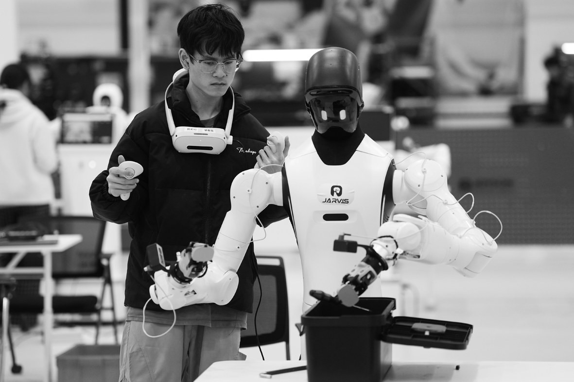 在宁波普智未来机器人有限公司,技术人员调试人形机器人在工业场景下的应用(3月24日摄)。