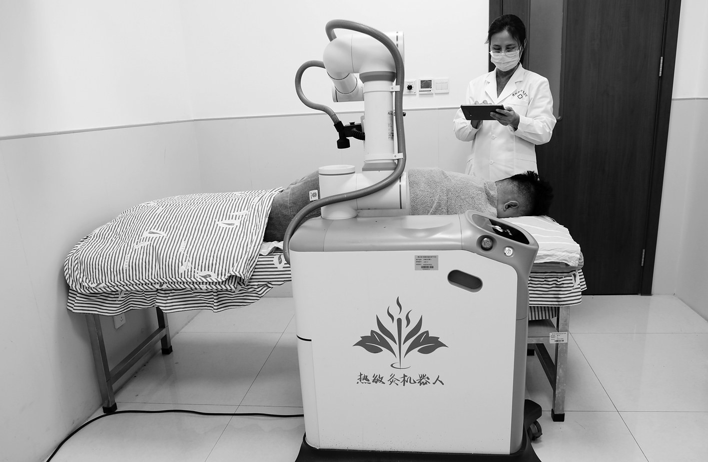 4月7日,在山东省滨州市博兴县中医医院灸疗室,医护人员用热敏灸机器人为患者进行艾灸治疗。4月7日是世界卫生日,国家卫生健康委将今年中国宣传主题确定为“共享科技创新,携手共促健康”。新华社发陈彬/摄