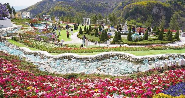 4月8日,游客在红叶柿岩旅游区云崖花园内游览。时下,山东省淄博市博山区红叶柿岩旅游区内繁花绽放。景区通过场景创新、业态融合打造沉浸式赏花场景,有效拉长游览与消费链条,带动周边村民就业增收,将生态美景转化为富民产业。新华社记者朱峥/摄