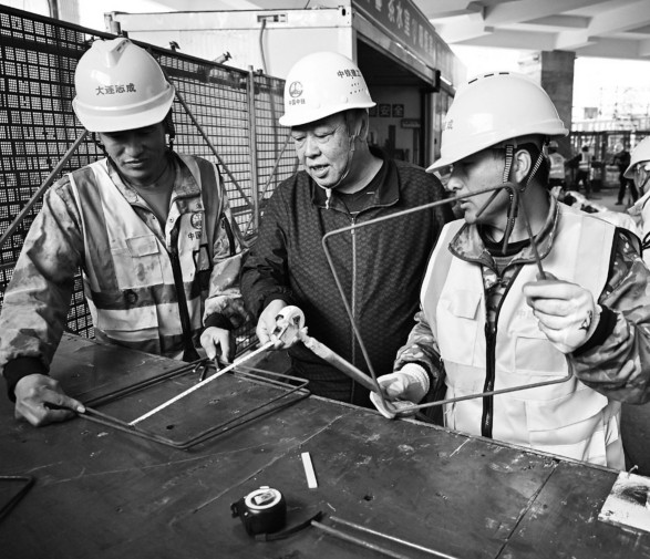 图为在青岛市南京路1号项目比赛现场,一名评委(左二)在钢筋工团体赛中测量钢筋。