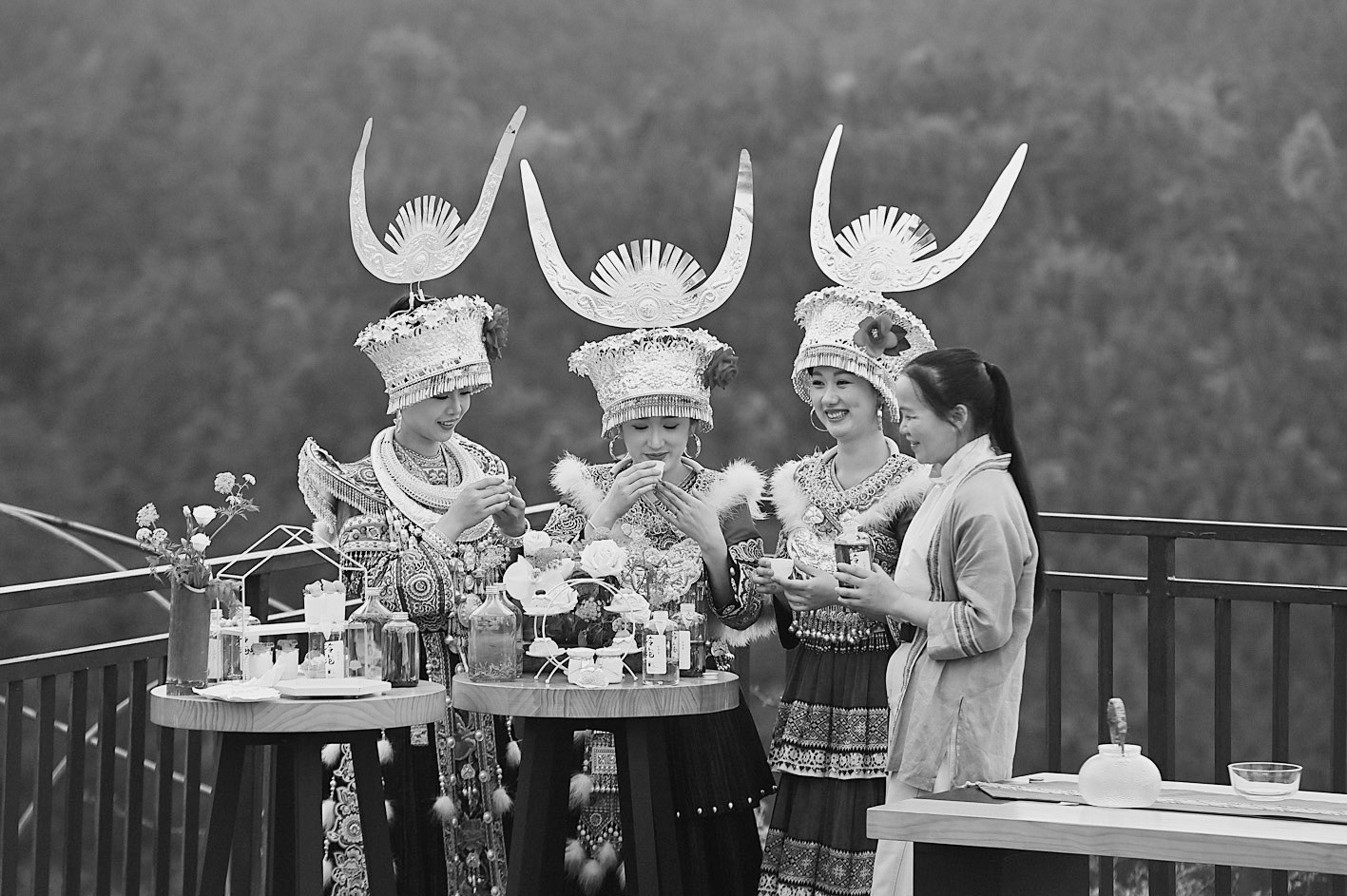 4月12日,在广西融水苗族自治县水融香粤桂协作现代农业产业园,人们在茶山上品茶。4月12日,广西柳州市融水苗族自治县举办粤桂协作大苗山踏青茶旅文化活动,茶商和游客欢聚苗乡,赏春色、品春茶、话产业发展。近年来,广西融水苗族自治县在结对帮扶的广东廉江市协作下,充分利用特色茶资源,投入粤桂协作帮扶资金,建设现代特色农业产业综合示范园区,发展茶文旅融合产业,助力乡村振兴。新华社记者黄孝邦/摄