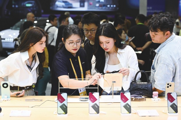 4月13日,参观者在第六届消博会主会场了解华为产品。4月13日,第六届中国国际消费品博览会在海南举办。本届展会是海南自贸港全岛封关运作后的首届国家级消费盛会,以“开放引领全球消费,创新驱动美好生活”为主题,汇聚了来自60多个国家和地区的超过3400个品牌参展,搭建起全球消费精品展示交易的国际化平台。新华社记者杨冠宇/摄