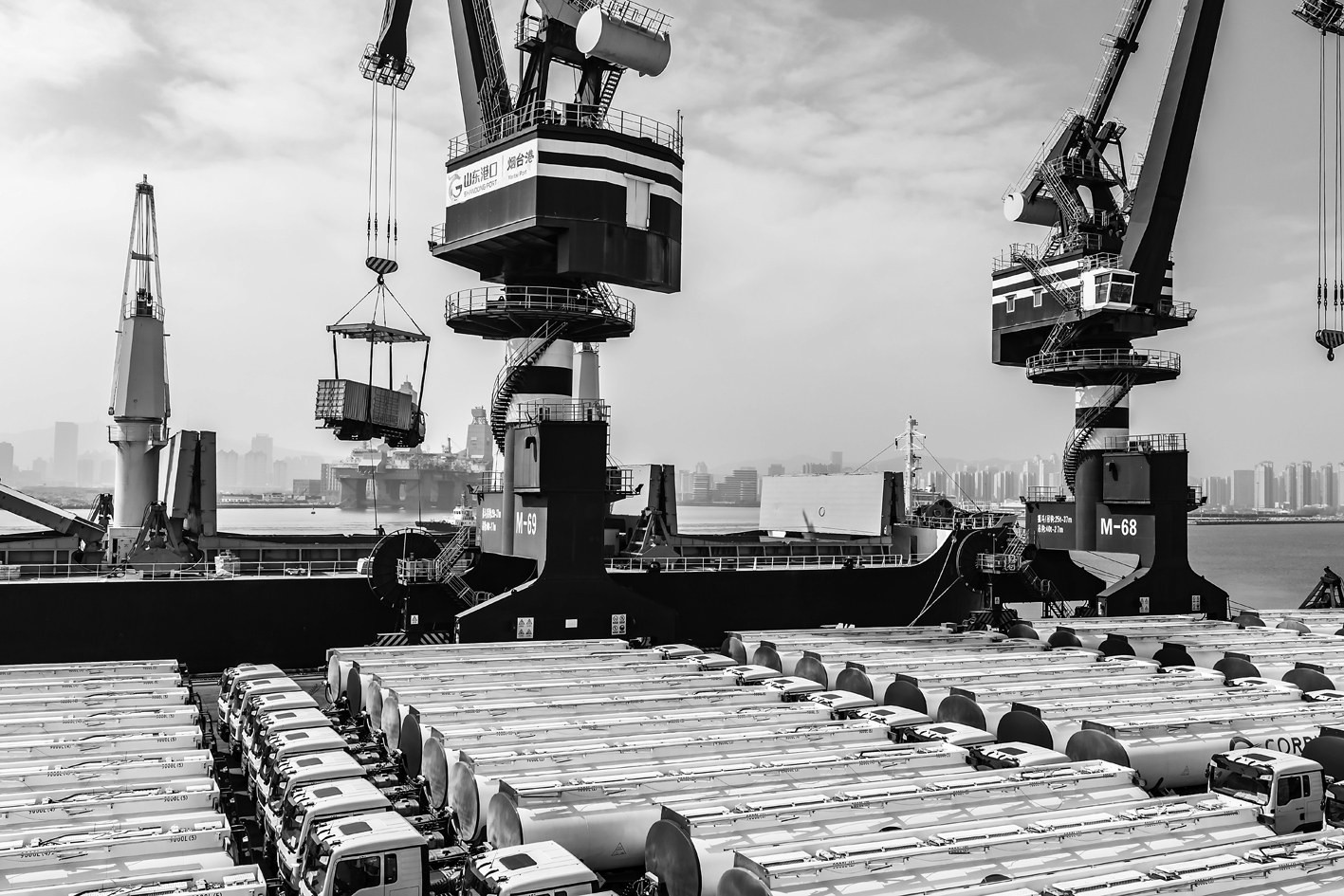 4月13日,出口科特迪瓦的车辆在山东港口烟台港装入中非班轮。近日,货车、油罐车、混凝土搅拌车等车辆在山东港口烟台港陆续装船,准备出口非洲。今年一季度,烟台港中非件杂货班轮航线发运量突破200万吨,同比增长31.9%,运输货种高度契合非洲国家基建和民生需求。新华社发张超/摄